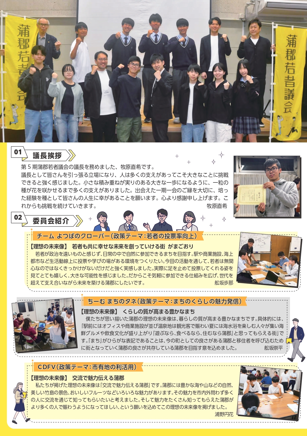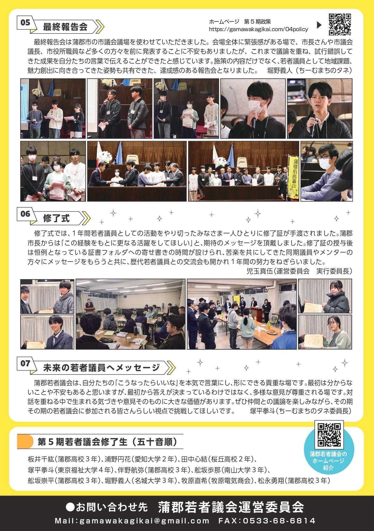 第5期では蒲郡市役所の協力もいただきながら、具体的な課題に若者たちが挑戦して、さまざまな事業や提案を行っていただきました。報告書にはそれぞれの若者議員からもコメントをいただいているので、ぜひご覧いただければと思います。