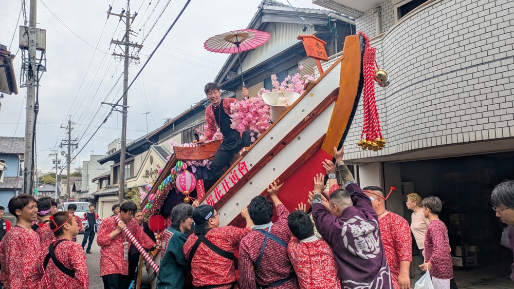 形原漁港を出発し、形原北小・形原温泉交差点まで行き、そこから形原中学校を経由して形原神社へ向かう……というなかなかハードな距離。私は撮影係でしたので、他の人より体力的に楽だったと思いますが、日ごろの運動不足もあって足が痛くて痛くて……。御木曳・伊勢音頭・松前節の3曲を唄うのですが、場所によってはホースやバケツで水をかけられたり、船を揺らされたり・持ち上げられたり。港町らしい、ザ・お祭りという感じ。