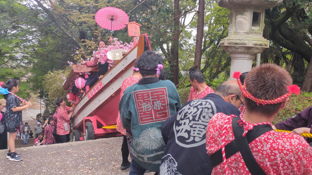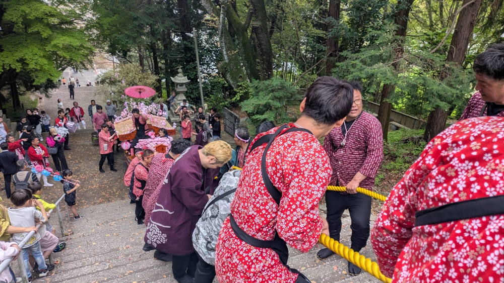 形原神社では、まずはながーい階段を引っ張り上げ、最後には境内の入口まで船を突っ込ませるなど見どころ満載。私も3回ほど船に乗って唄いましたが、順番的に階段を引っ張り上げるときに乗るタイミングがあり、楽しさ半分・怖さ半分な感じでした(笑)