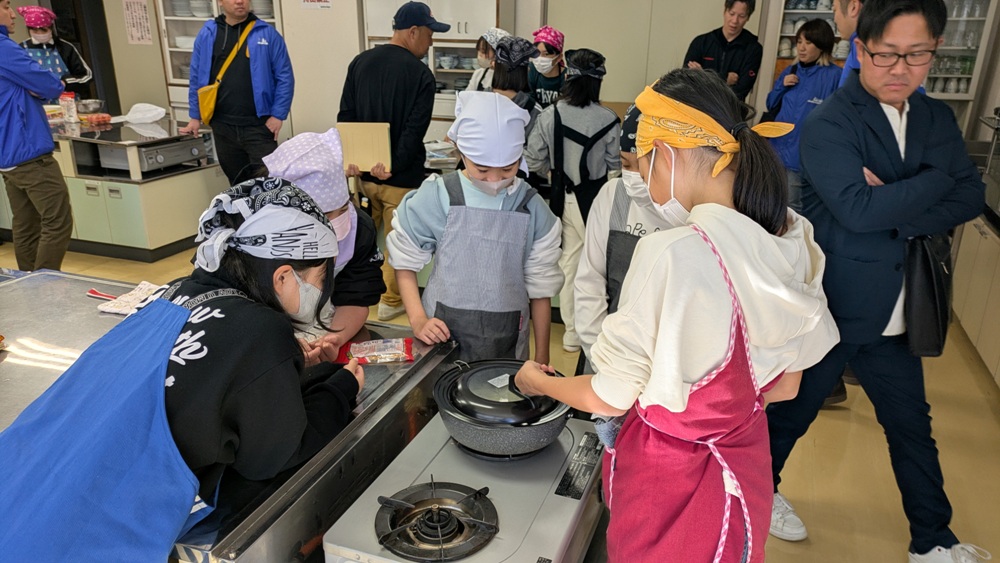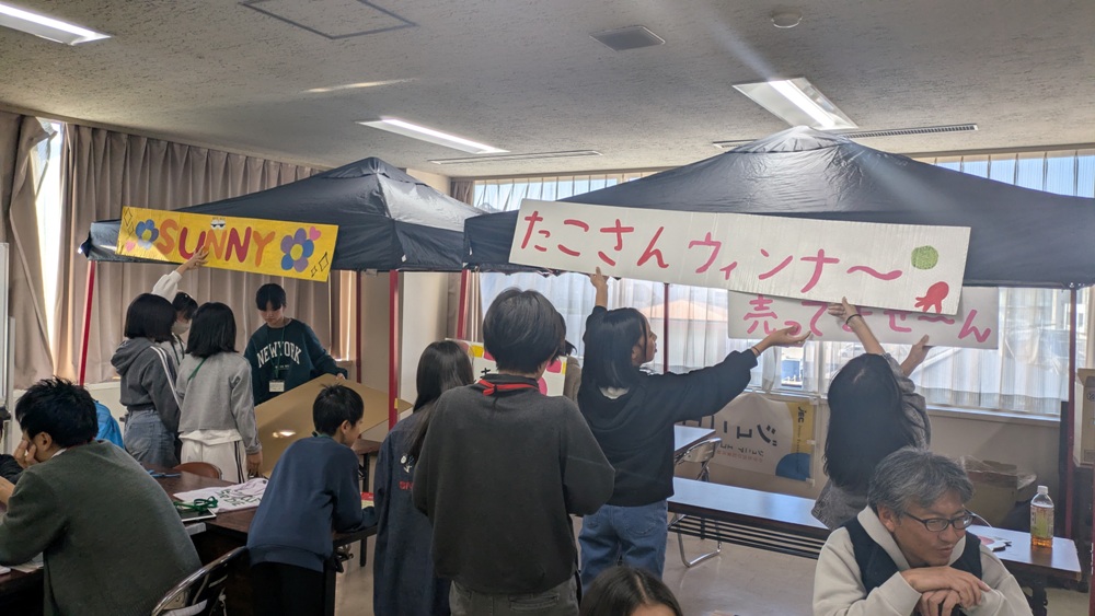 午前は、接客や衛生に関する講義を行って、その後は各グループが夏休みに作ってきた看板を持ち寄り、実際に販売するテントをどう飾り付けるか確認したり、準備までの流れを確認していました。午後は、飲食販売をするグループは試作を行うということで、地域の会館の調理室を使っての調理。私が行ったところは、豚汁・クッキー・ポップコーンなどを試作。