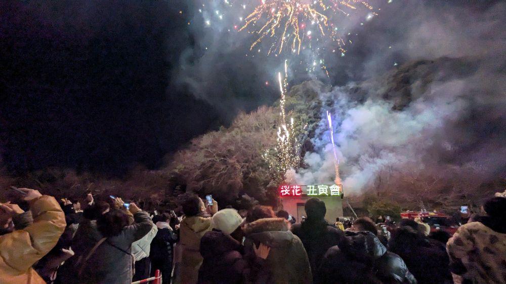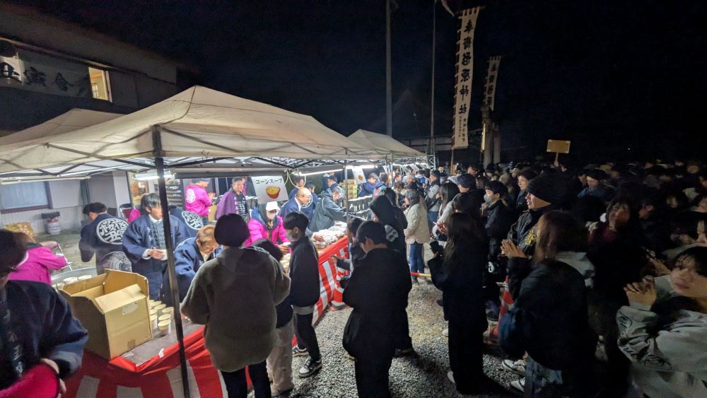 新年のカウントダウンとともに花火の打ち上げが行われ、その後にはお菓子・飲み物・赤飯・団子・コンポタの振る舞い。非常に多くの方がいらっしゃって、大いに賑わって無事に終了しました。そのまま片付けや撮影が終わり解散になったあと、そのまま初詣をさせていただきました。