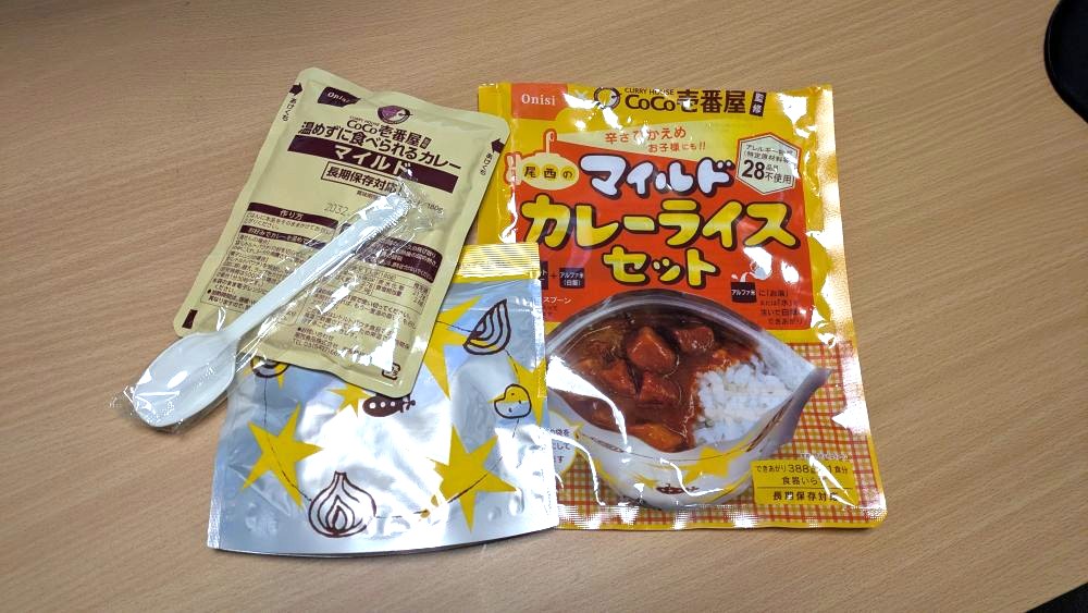 防災食でよく眼にする尾西食品とCoCo壱がコラボした商品で、賞味期限が数年持つ商品。米+カレールーがセットになっていて、お湯だけでなく、水でも食べられるようになっています。