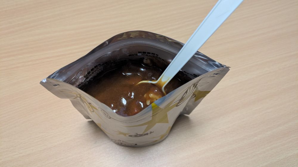 カレー自体が温めなくてもサラサラな状態。パックがそのまま器になるので、その辺りも含めて便利。せっかくなのでお湯は使わず、水だけで冷たい状態で食べましたが、普通にカレーとして違和感なく食べられて、美味しかったです。